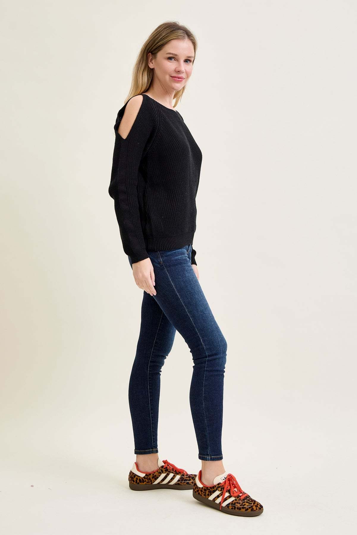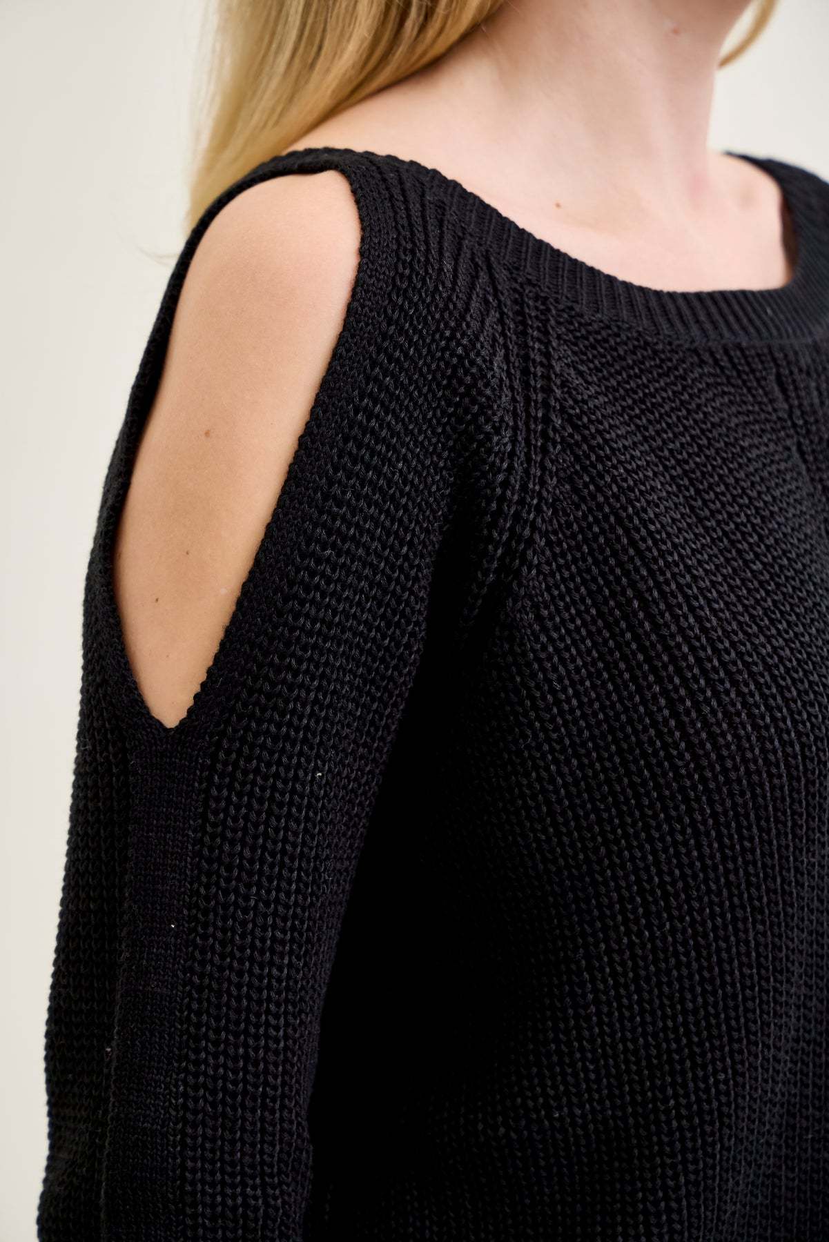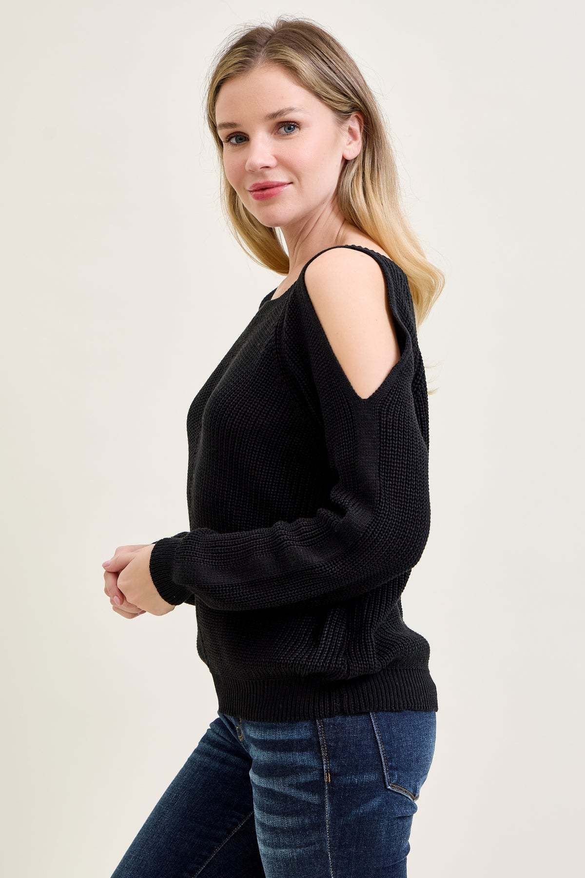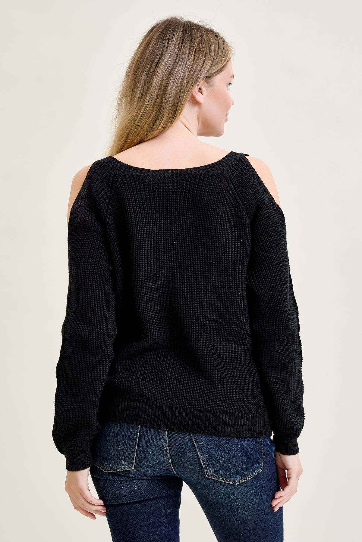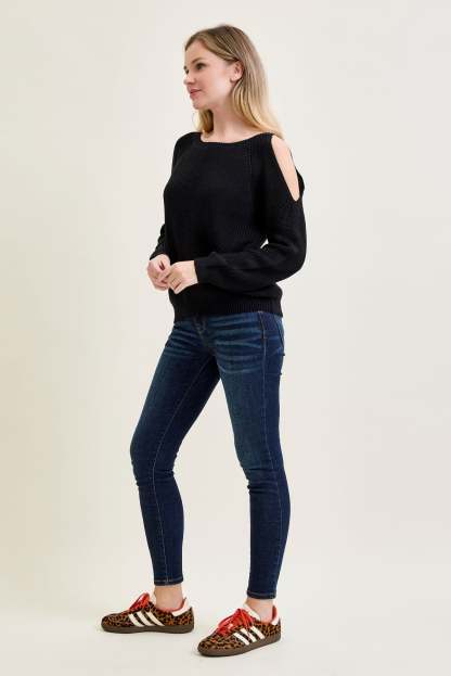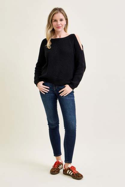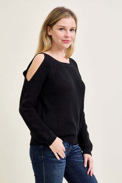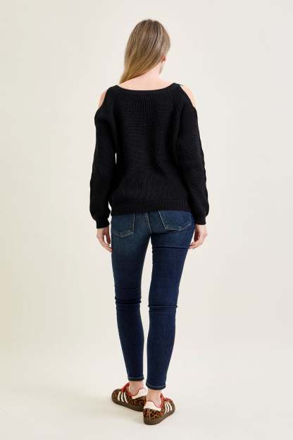 Chevron Stitch Cold Shoulder Black Sweater