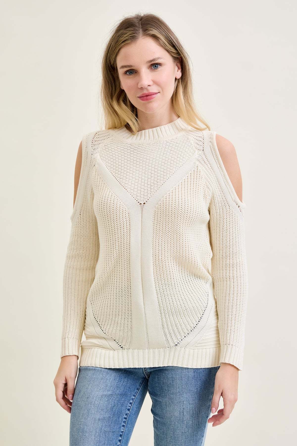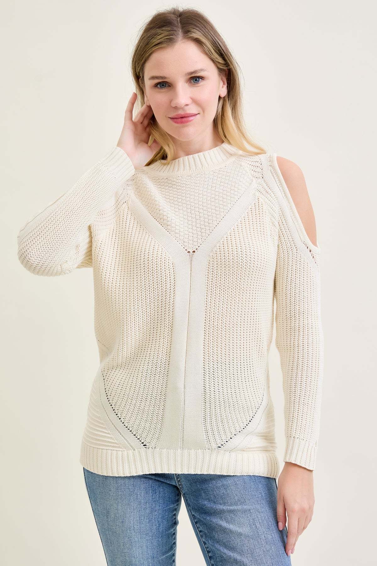 A modern take on the cable knit, cozy warmth with a touch of shoulder-baring charm.