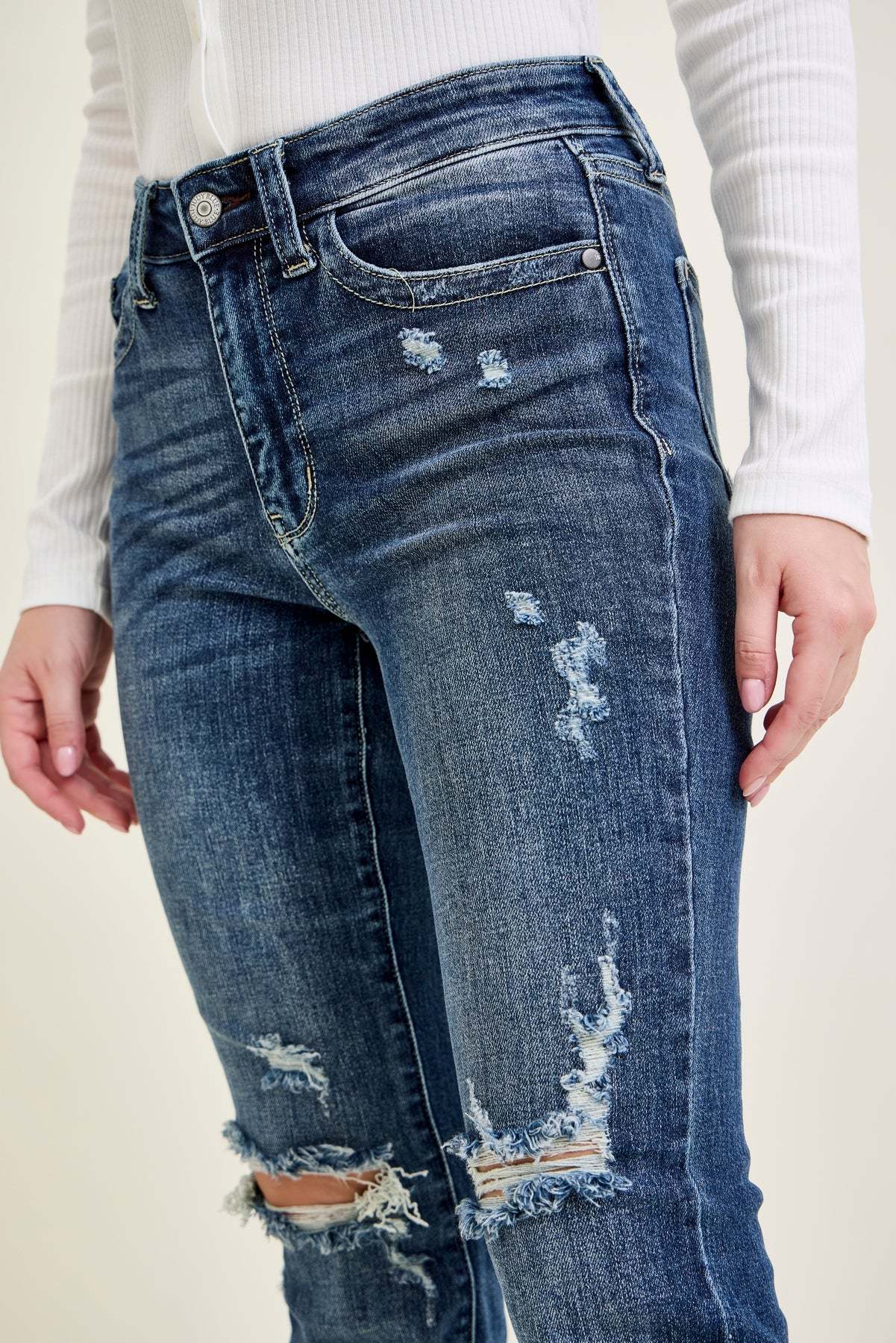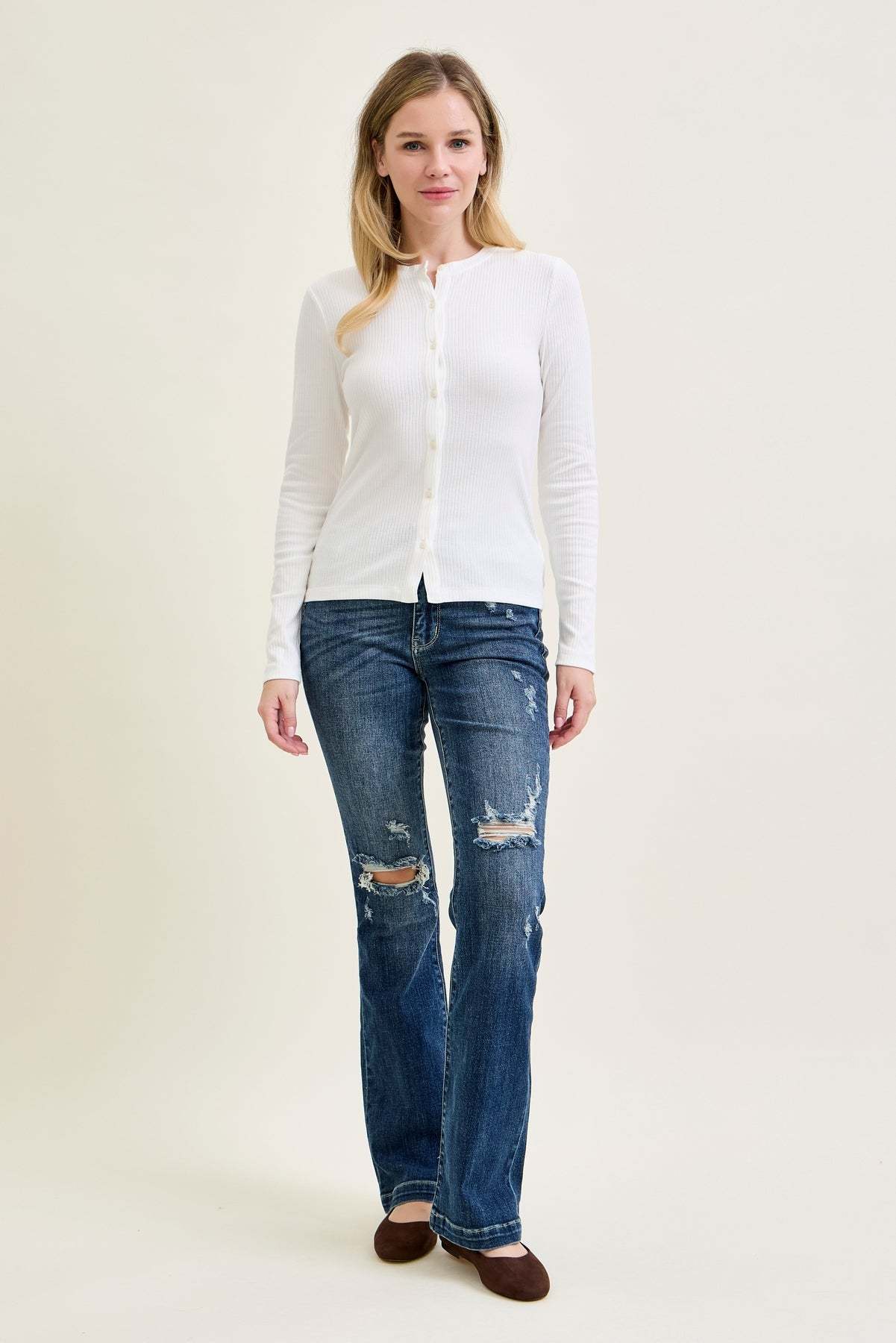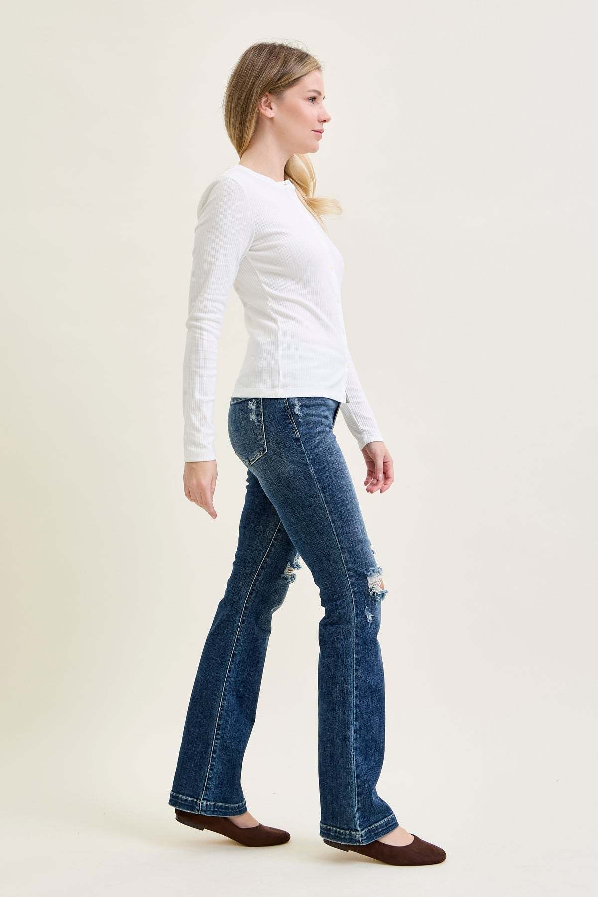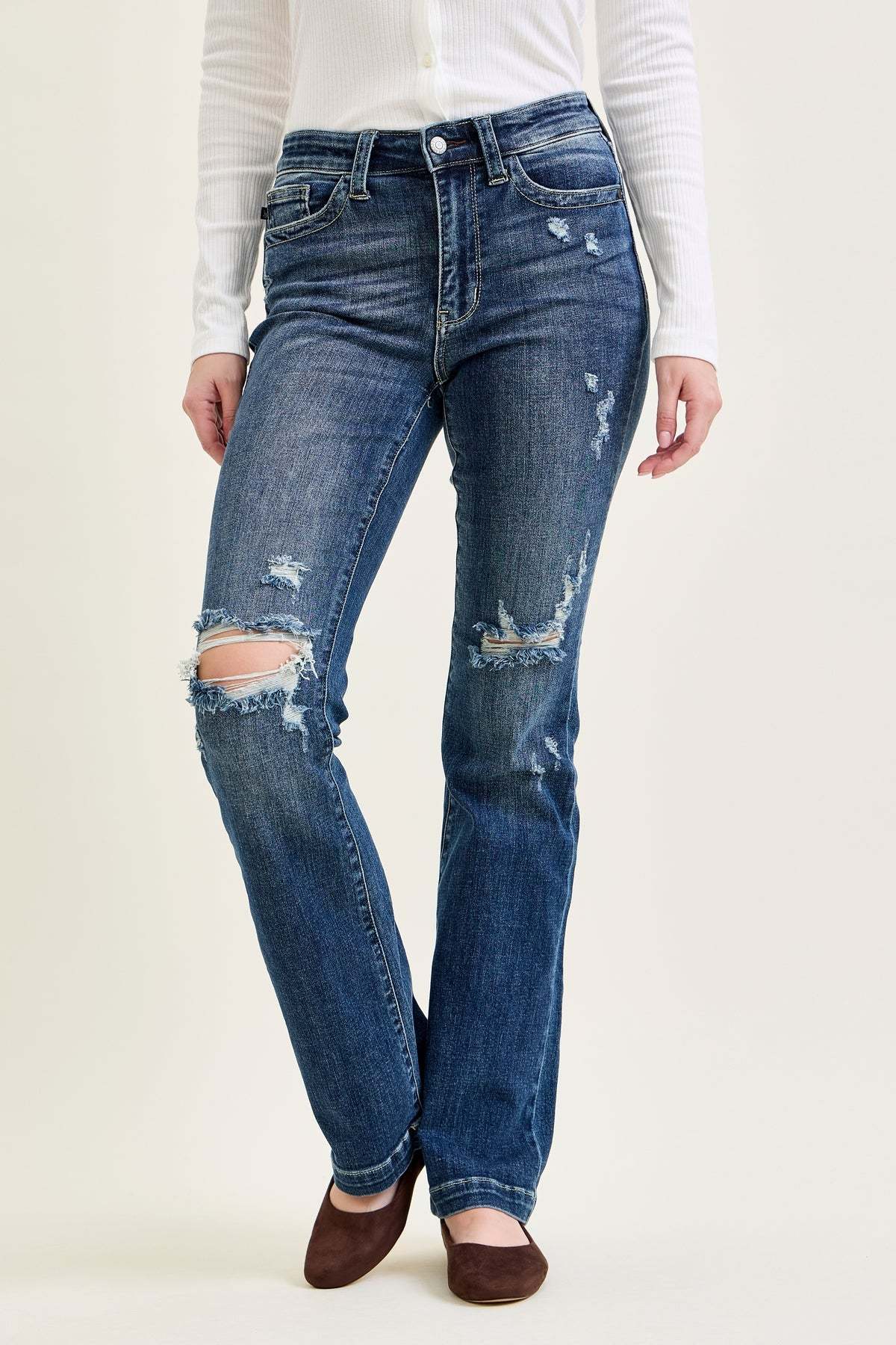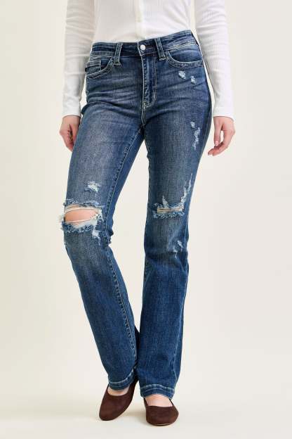 - Subtle Ripped Accents: Mildly ripped detailing adds a touch of edgy style to the classic bootcut design.