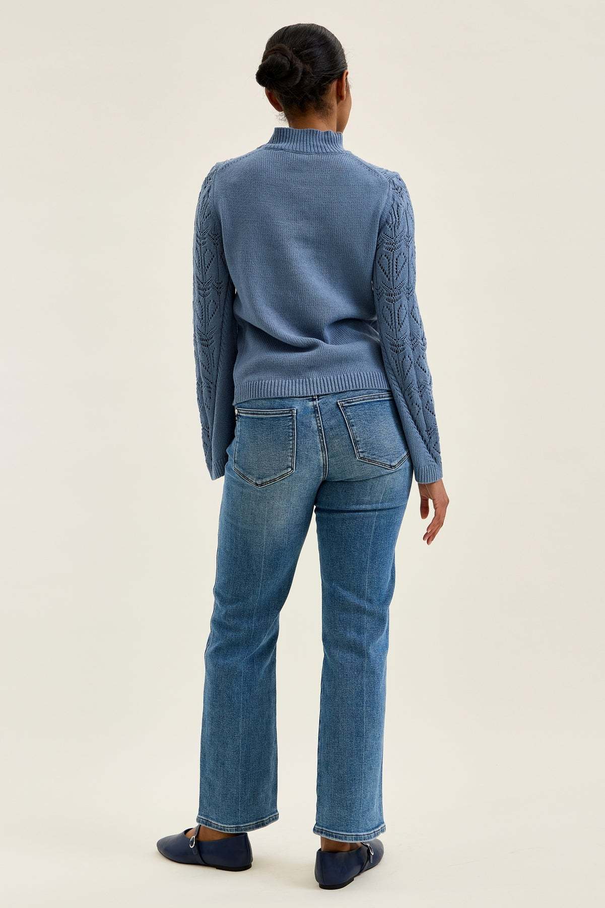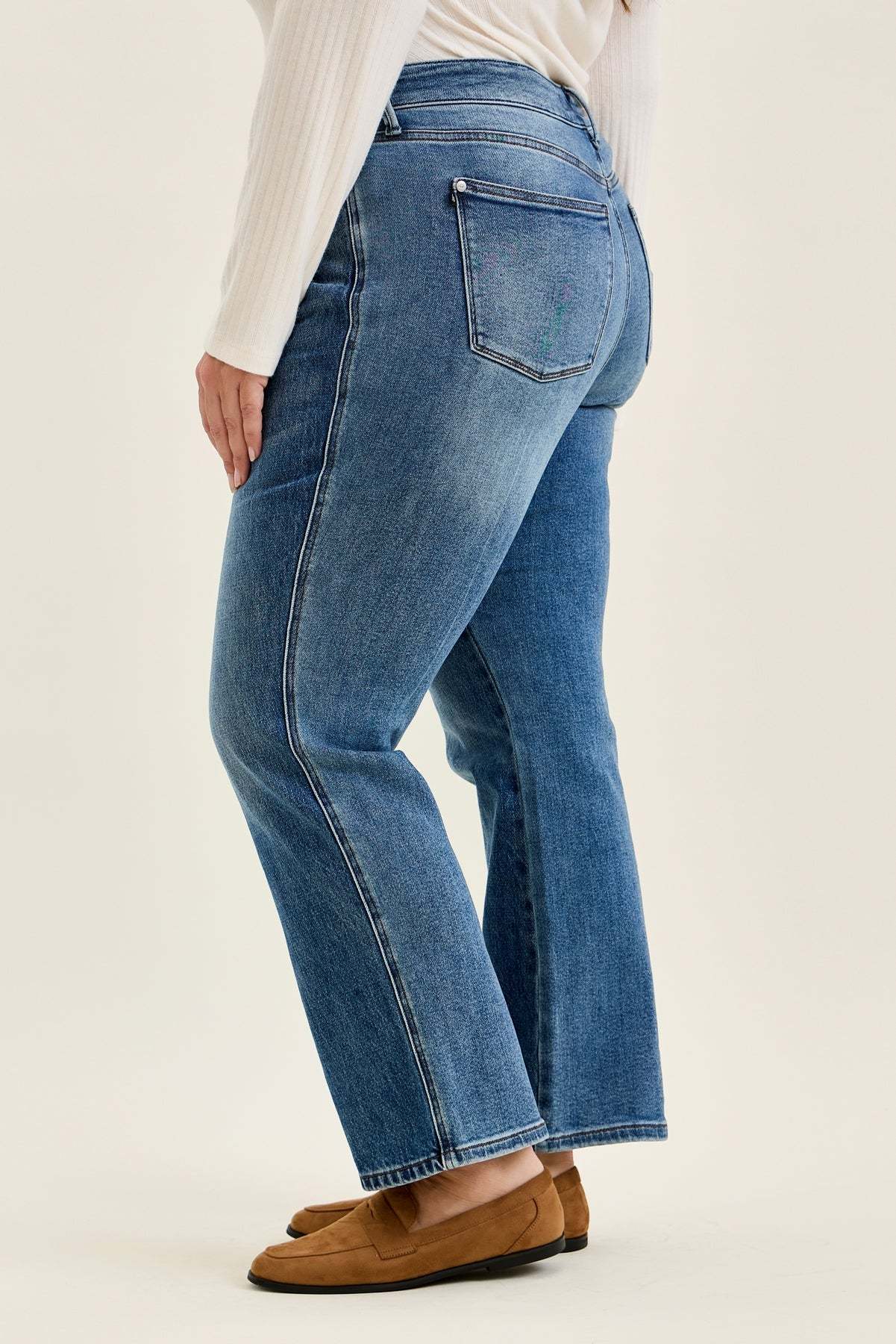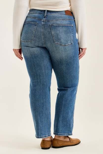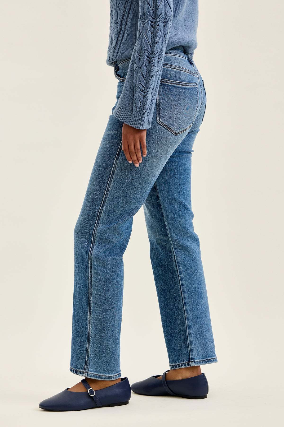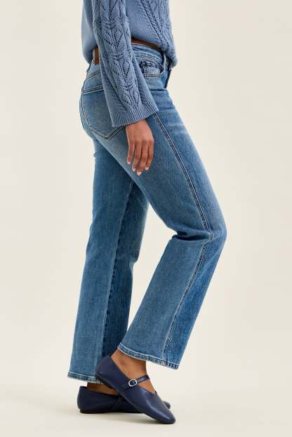 Meet Kimberly, the slim straight jean blending rigid vintage authenticity in front with hidden stretch comfort in back.