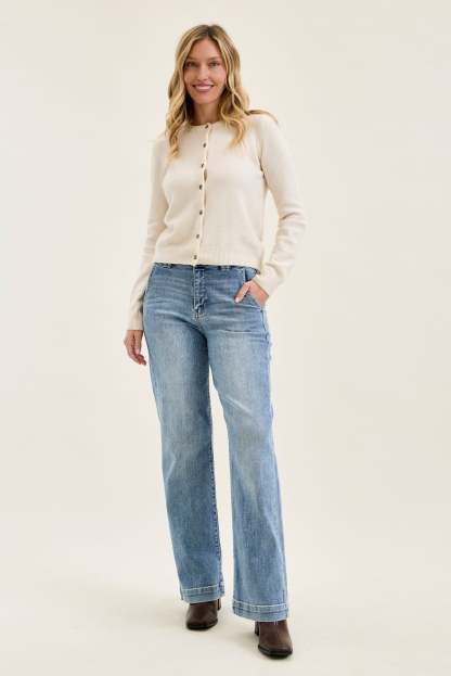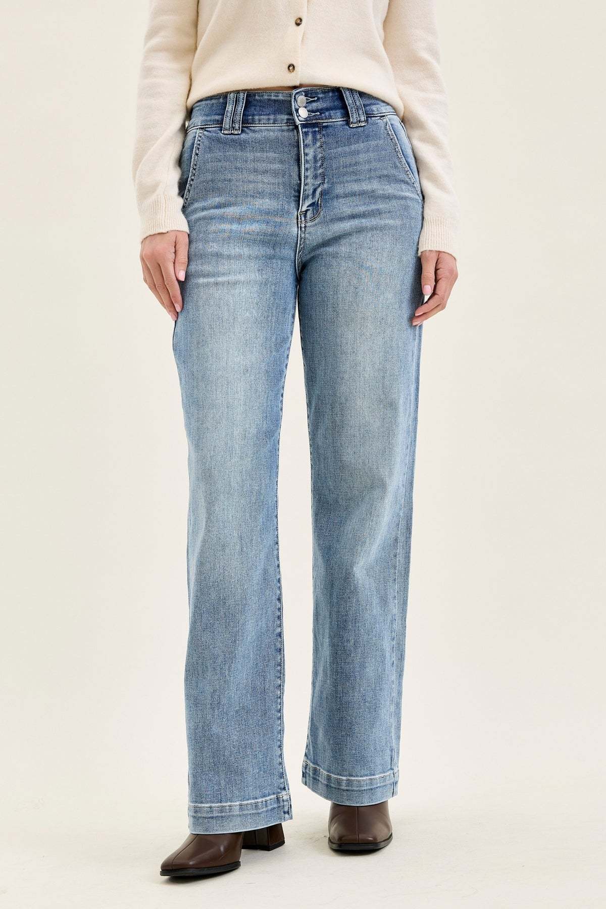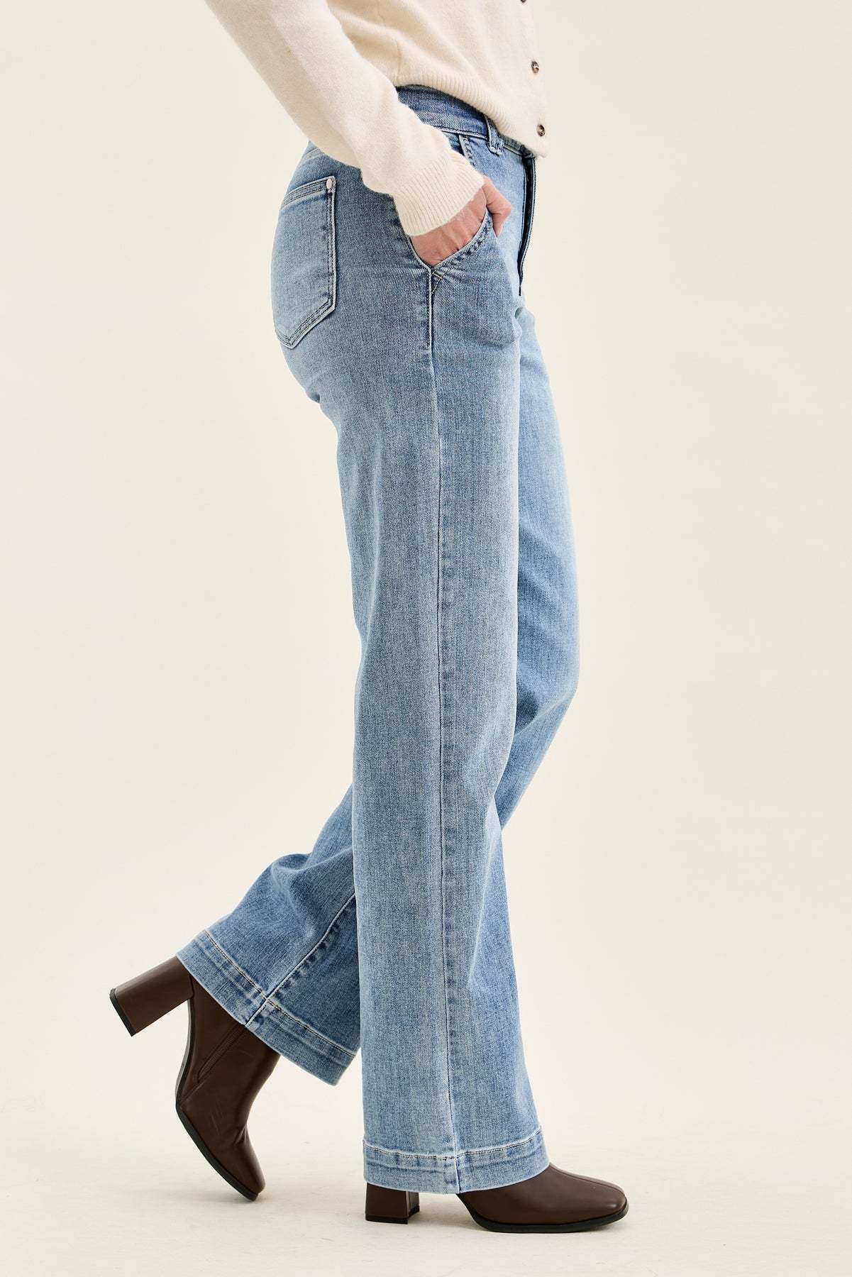 Effortlessly polished with a soft touch of stretch, Penny brings that clean trouser vibe in a wearable everyday denim. Light grey-blue makes it modern, while the wide leg keeps it breezy and elevated.