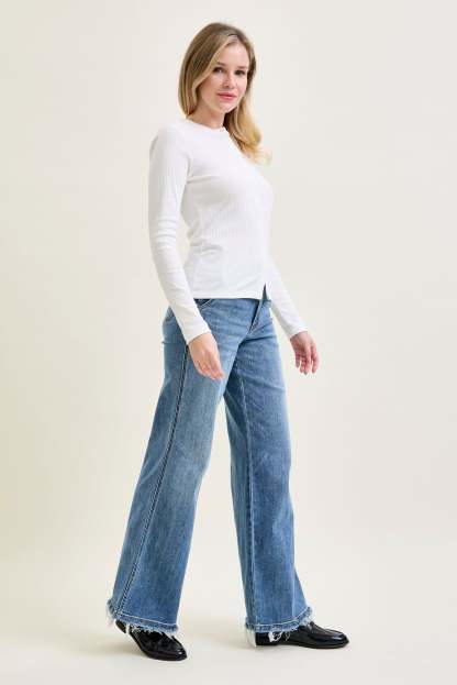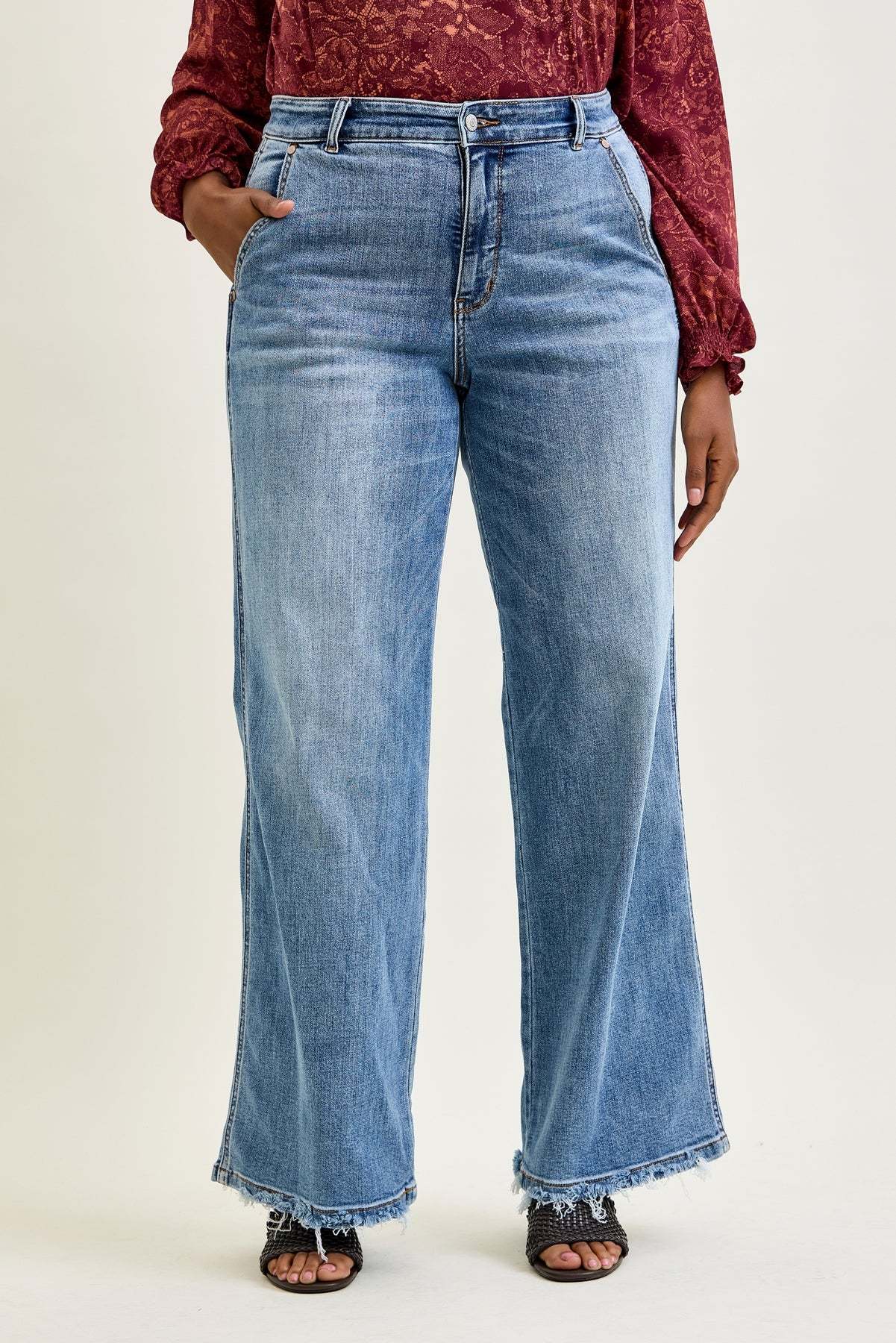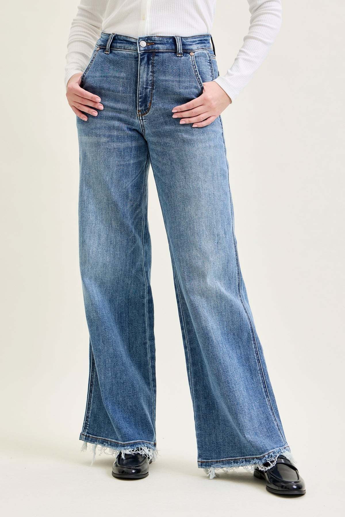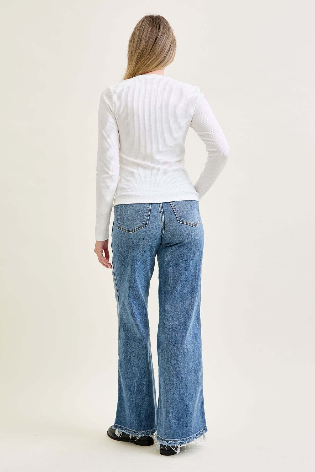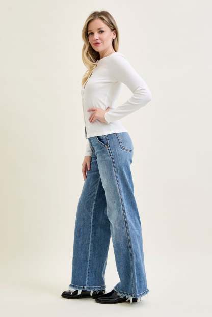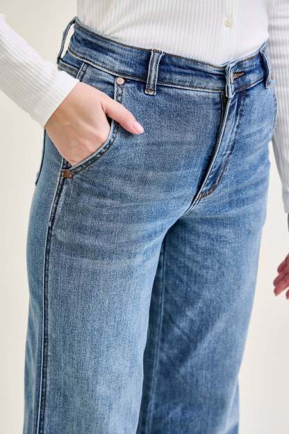 These wide leg jeans bring back the retro feel with a comfy stretch and a flattering high rise that pairs perfectly with tucked tees or cropped tops. Effortless, fun, and made to move with you.