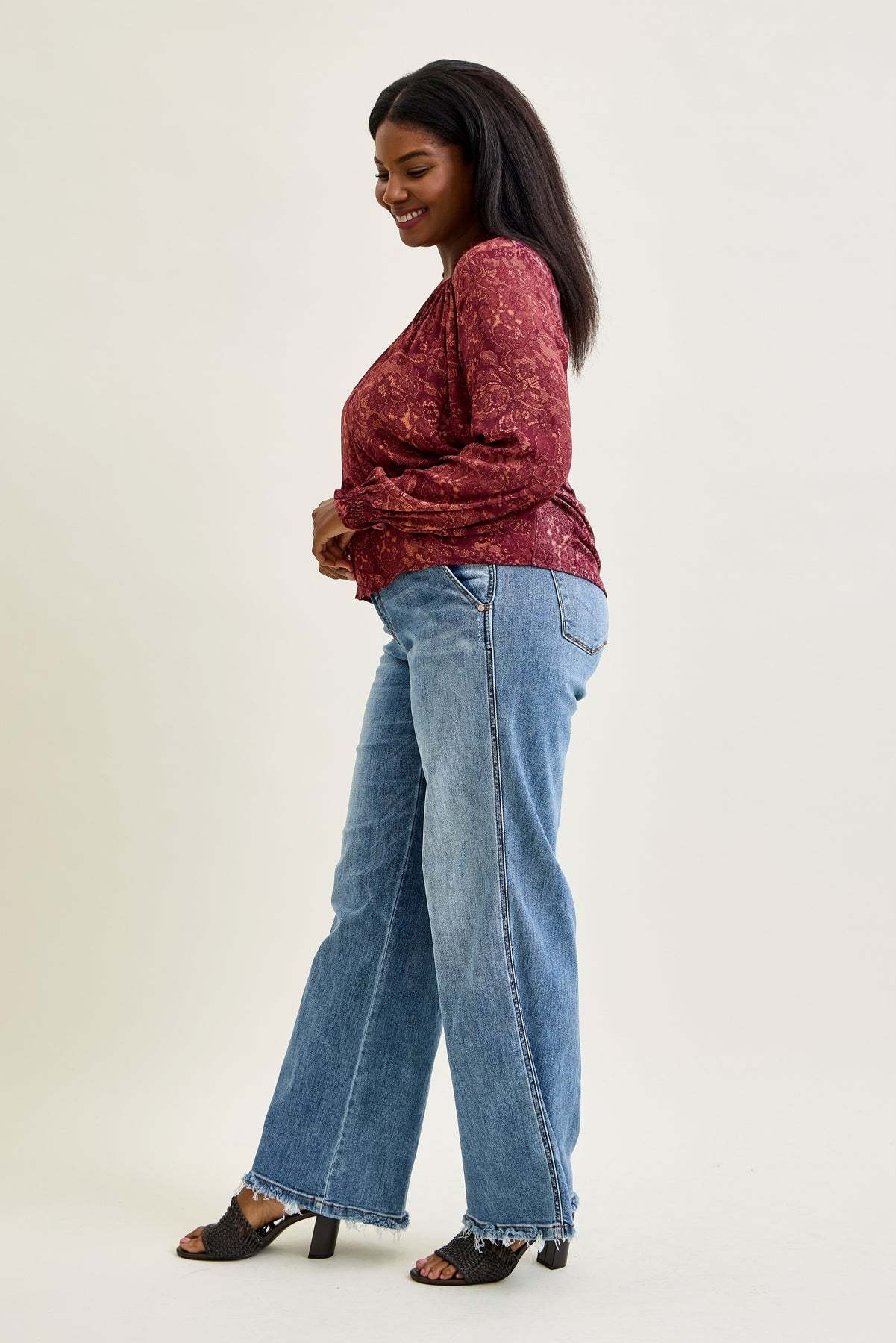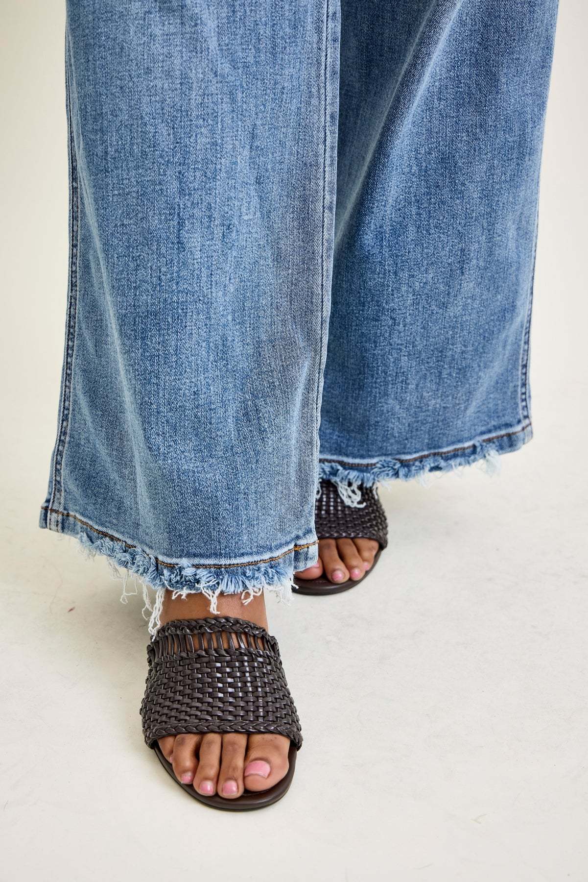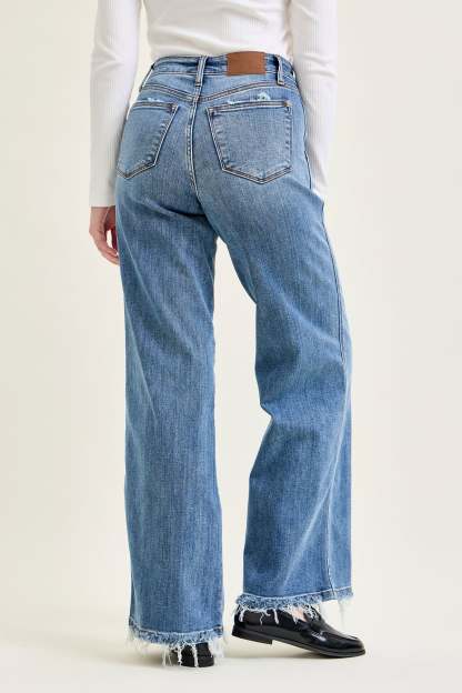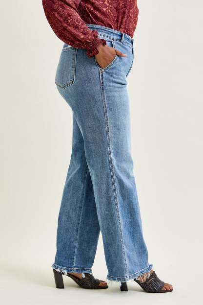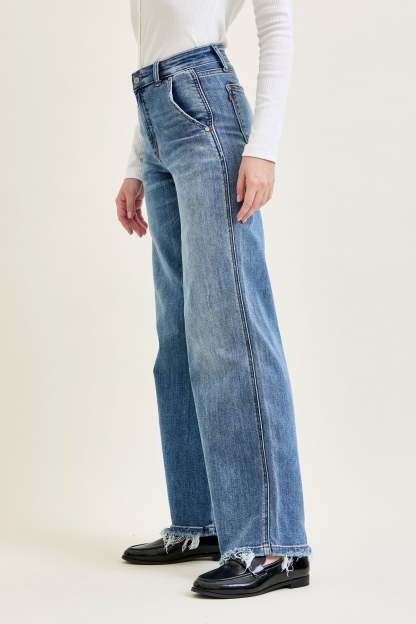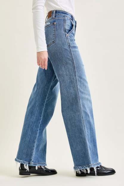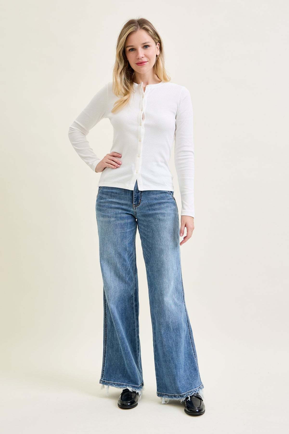 These wide leg jeans bring back the retro feel with a comfy stretch and a flattering high rise that pairs perfectly with tucked tees or cropped tops. Effortless, fun, and made to move with you.