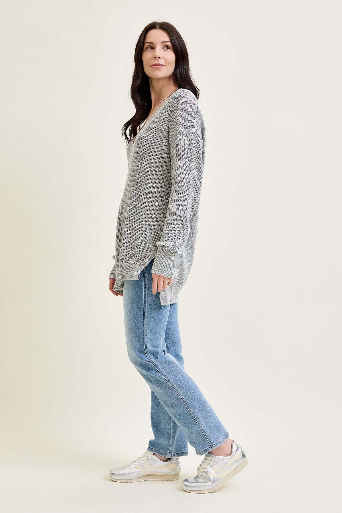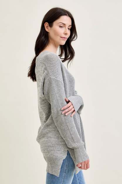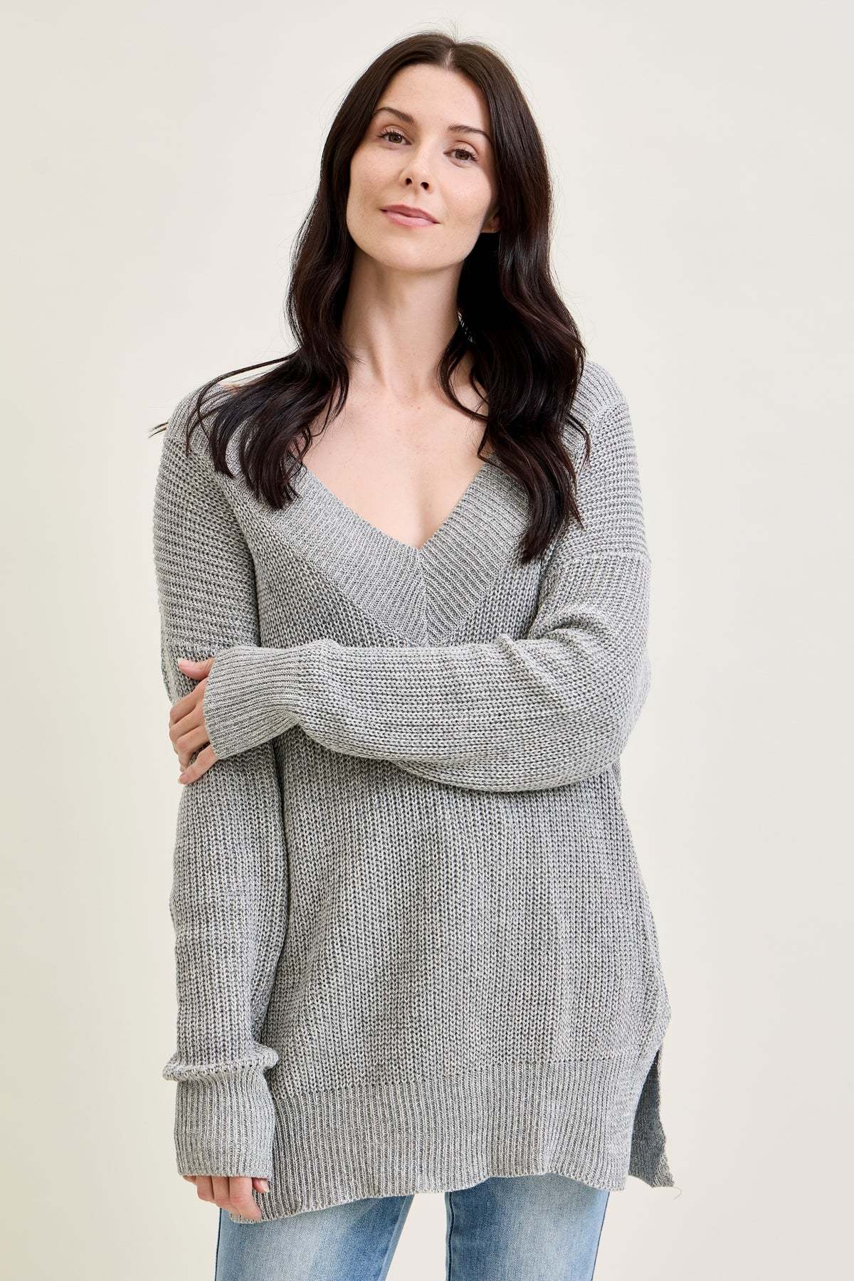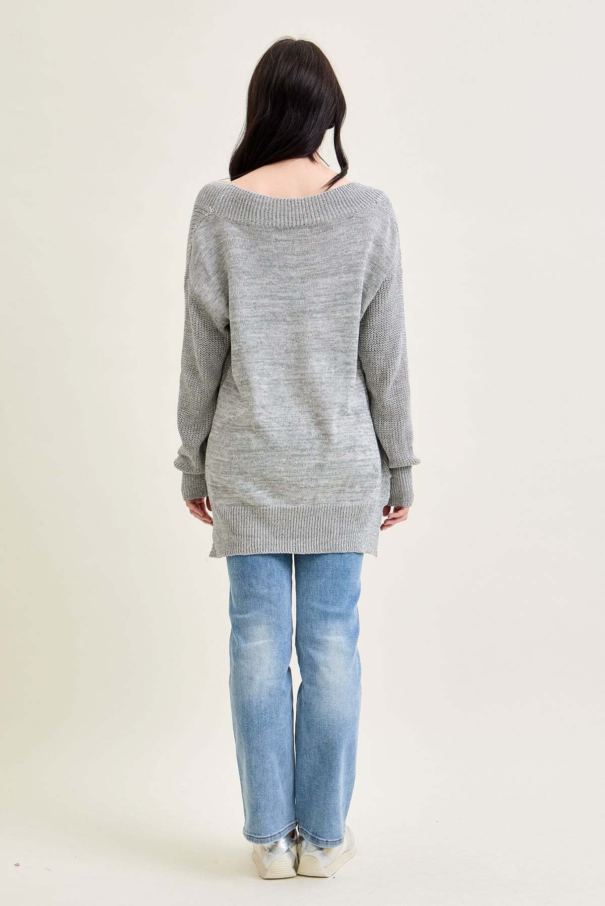Slouchy V-Neck Off Shoulder Grey Sweater